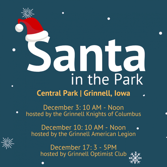 GRINNELL – Grinnell Area Chamber of Commerce is excited to announce the return of the Santa in the Park series beginning Saturday, December 3. For three Saturdays in December, families are invited to visit Santa in Grinnell’s Central Park under the shelter house.