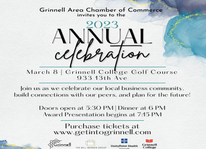 GRINNELL, IA – The Grinnell Area Chamber of Commerce is excited to announce the return of the Annual Celebration on Wednesday, March 8 beginning at 5:30 PM. The event will be hosted at the Grinnell College Golf Course and will feature a refreshed schedule of events. This year’s event is sponsored by the Bill Menner Group, UnityPoint Health – Grinnell Regional Medical Center and Grinnell College.