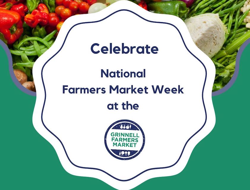 GRINNELL, IA – The Grinnell Farmers Market will be celebrating National Farmers Market Week August 6-12. Be sure to stop by market this week and show your support to all of the amazing vendors market has to offer. The Grinnell Farmers Market is open Thursdays 3-6PM and Saturdays 10AM-Noon in Central Park.