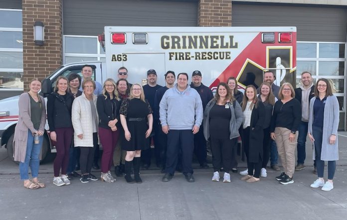 Pictured L-R: Marissa Pronschinske – Grinnell Chamber, Rachel Arseneault – Ramsey-Weeks, Jennifer McAlexander – JM Consulting & Hawkeye Lock & Security, Dorothy Spriggs – Carriage House Bed & Breakfast, Patrick Duffey – Grinnell Fire & Rescue, Whitney Bair Crawford, Agent with New York Life, Monica St. Angelo – Grinnell Area Arts Council, Vince Lukehart – Grinnell Fire & Rescue, Cynthia Albert – OnMedia, Christian Williams – Grinnell Fire & Rescue, Eric Pagan – Grinnell Fire & Rescue, Chief Dan Sicard – Grinnell Fire & Rescue, Zared Sittig – Grinnell Fire & Rescue, Hannah Vos – UnityPoint at Home, Ashley Symbol – First State Bank, Brooke Holder – Poweshiek County Public Health, Stephanie Lair – UnityPoint Health – Grinnell Regional Medical Center, Charlie Isaacs – Theisen’s, Lisa Cirks – Cirks Financial Services, Matt Moyer – Bayer Crop Science, Rachael Kinnick – Grinnell Chamber