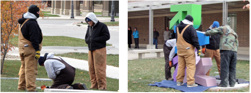 Despite a twenty-degree temperature and a brisk breeze out of the southeast, ASI personnel were at work shortly after 8:00 a.m., Friday, November 10, drilling into a concrete pad already poured on the west side of the south wing of the library. Once anchors were installed, the sign’s base was affixed, and the letter assemblage was added.