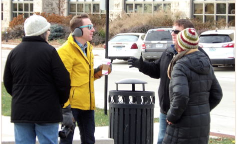 McGuire (pictured below in the yellow jacket) a prominent Grinnell graphic artist, photographer, and web designer, sought to create a destination sign—a concept that means more in the digital age of social media than an awareness that one has arrived where one intended to go.