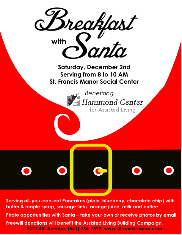(Grinnell, IA – November 13, 2017) St. Francis Manor and Seeland Park are inviting the public to enjoy “Breakfast with Santa” on Saturday, December 2nd. All-you-can-eat pancakes (plain, blueberry, and chocolate chip) with butter and maple syrup, sausage links, orange juice, milk and coffee will be served between 8 and 10 AM in the St. Francis Manor Social Center located off St. Francis Drive north of 4thAvenue. All ages are also invited to have their pictures taken with Santa at the breakfast. Attendees may take their own pictures or receive photos taken by St. Francis Manor via email after the event.
