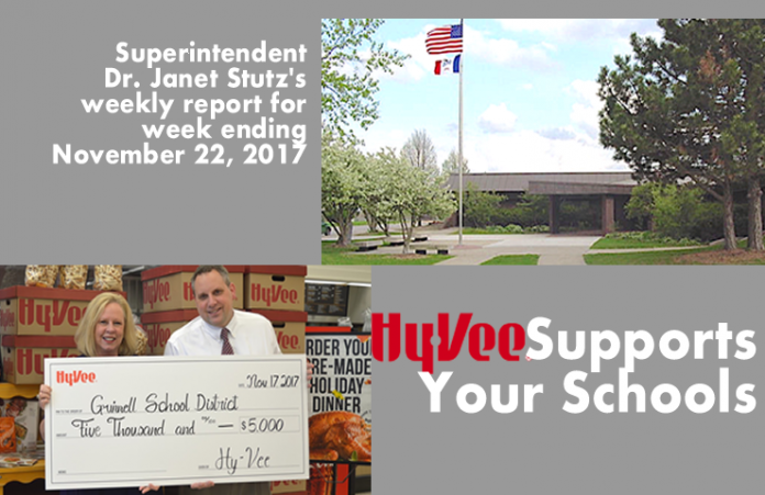 I would like to send a big thank you out to our local Hy-Vee, under the direction of Ryan Benz. This week I had the honor of receiving a $5,000 check for our district. This is just one of the many ways Hy-Vee supports our schools, and I am grateful for their constant efforts to make Grinnell a better place to live and go to school.