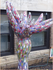 The concept of an artist-in-residency program is by no means new to Grinnellians since the Grin City Collective has enlivened the town with works of art such as Wilma Wyss’ version of a milkweed, in front of the south portion of the Grinnell Arts Center (below left); and “Footprints of Grinnell,” a work by Tiberiu Chelcea from 2016, now on display in the north window of Browns Shoe Fit (below right).