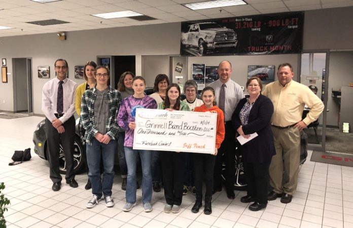 GRINNELL, IA (December 5, 2017) – Wes Finch Auto Plaza finished off this year’s donation contest with a $1,000 donation to the Grinnell Band Boosters! Voting took place in October, and the winner was announced on November 1st. Grinnell Band Boosters did a wonderful job of engaging their Facebook followers, and pulled ahead in the final week of voting!