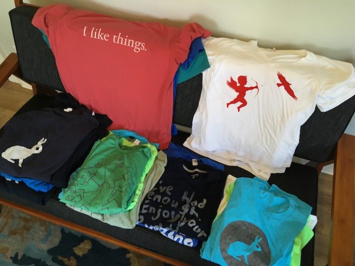 Susan Villarreal, Biology Professor at Grinnell College, and Ryan McGuire, Grinnell based designer and artist, handprinted and donated the first batch of shirts for an upcycle collaboration they initiated with the Second Mile to help give secondhand shirts a second chance. There are seven different original designs and many different colors and sizes. The shirts are available for purchase at Second Mile, and 100% of the sale of each shirt will go to the Second Mile to support their store and community efforts.