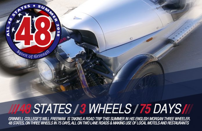 Freeman’s next challenging adventure will be the basis for his upcoming book. His love for adventure and discovery has led him to planning a truly breathtaking journey. In May 2018, Freeman will embark on an extensive road trip to visit all 48 Continental United States while traveling in a three wheeled vehicle. However, it is the way he will be going about this trip which is unique. He will be driving a 2017 Morgan Three Wheeler named “Spirit of Grinnell”. Not only will Freeman visit all 48 states in one trip, and visit each one in a meaningful way with the general goal of writing about the places he sees and people he meets, he put together a list of criteria that must be followed for the entire 48 state trip. The criteria includes: two lane highways only, unusual places, Native American sites, National Parks, historical sites, landmarks, and
