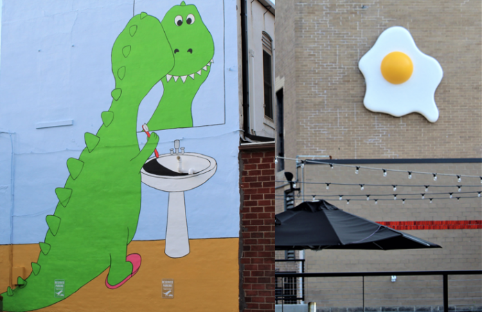 The dinosaur painting took only two days to complete, but those two days followed two weeks of “extensive planning,” McGuire reports. “We had Jav’s Painting prime the wall on a Tuesday and Colleen Klainert and I painted all the color in one day! A very long day, but still in one day.”