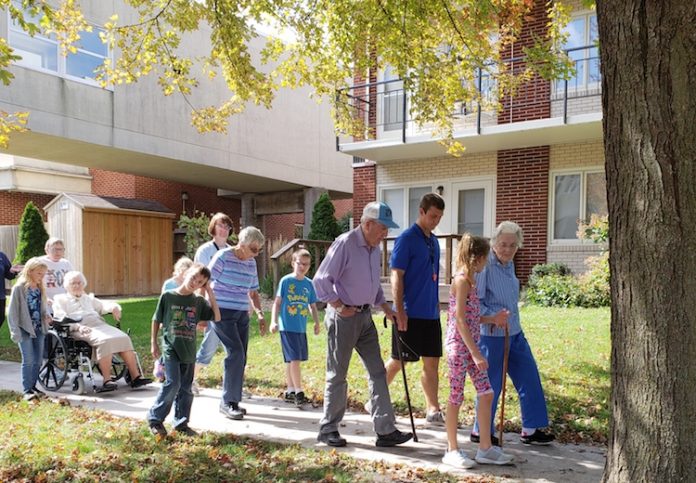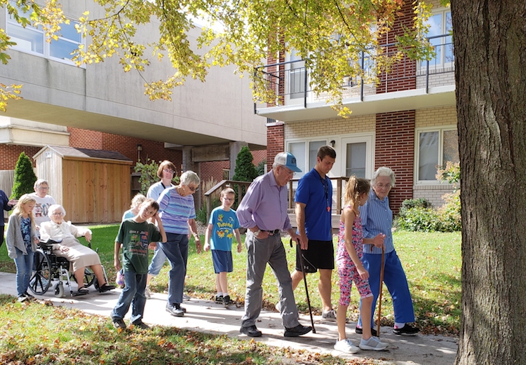 Over 50 Davis 4thgraders and teachers accompanied about 40 Mayflower Health Center, Beebe Assisted Living, and independent living residents and staff for the five-block walk. It began and finished in the beautiful Buckley Courtyard.
