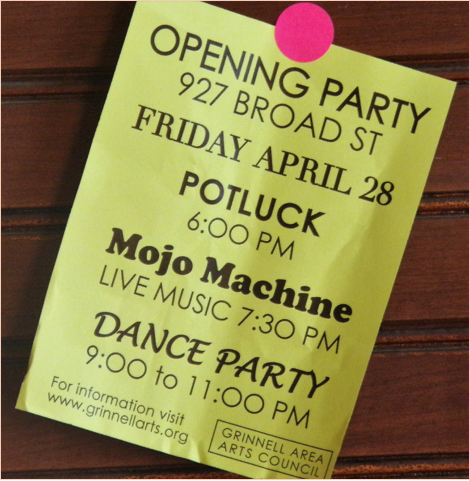 And there are possibilities beyond 927. One of the goals of the project is, according to Lacina, to help artists evolve and expand, perhaps using other spaces in other buildings in downtown Grinnell. Approximately twenty percent of the downtown is vacant, so the use of spaces by artists could be a solution beyond traditional retail enterprises.