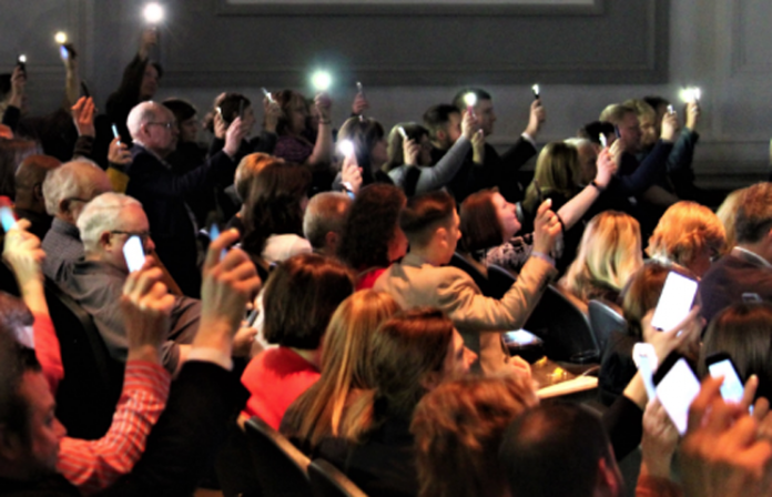 Prompted by Bill Menner, participants at the third Iowa Rural Development Summit flash their phones in the packed auditorium of Hotel Grinnell.