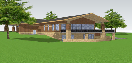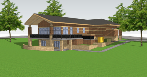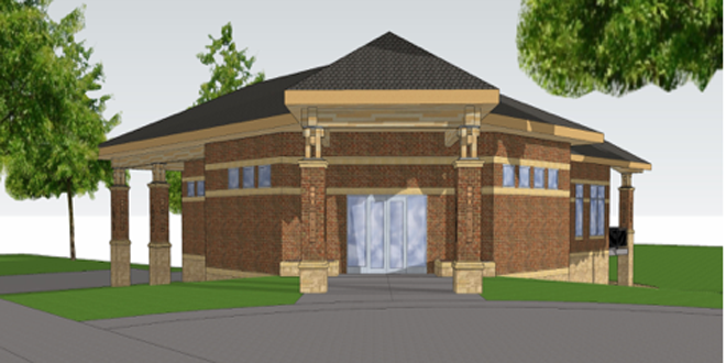 If all goes according to plans, the Veteran Memorial Building at the northwest corner of Central Park will one day look approximately like the picture above, a concept produced by John Bushong and Tom Lacina and presented by Lacina Monday evening, April 10, at the regular meeting of Grinnell’s Veterans Memorial Commission in the Community Room at the Drake Library.