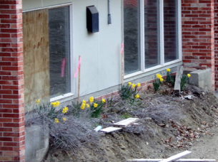 With a small space of soil to sustain them, and with the chaos of construction barely at bay, daffodils are blooming heartily nonetheless at the south end of the Veteran Memorial Building.