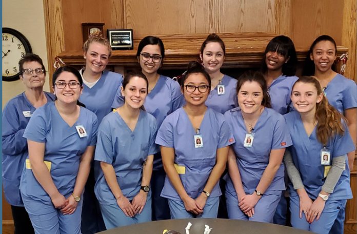 The students are pictured during a recent day of “clinicals” (on-site training) at Mayflower. Front row left to right are Danielle Mydlo, Jade Bustamante, Lynn Nguyen, Abby Nielsen, and Olivia Krousie. Back row, left to right are instructor Vickie Wieck, Jill Paladino, Devanshi Patel, Heidi Korando, Onyin Onuegbu, and Durowaa Agyeman-Mensha.