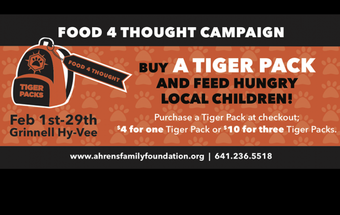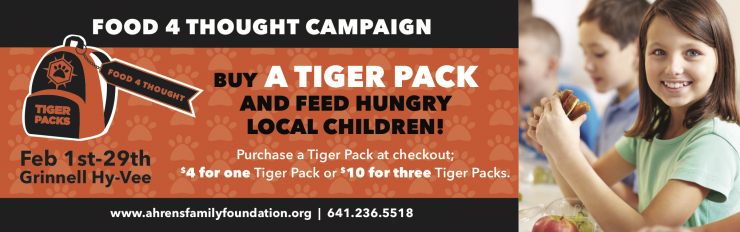 The Tiger Packs program is partnering with Hy-Vee for the Food 4 Thought Fundraiser. Tiger Packs is a local backpack program for pre K- 8th grade students in the Grinnell-Newburg school district to help combat hunger. Each week a bag of kid-friendly, nutritious snacks are sent home for the weekend to students who are enrolled in the program. During the month of February, Hy-Vee will sell the Tiger Packs bags in the store and online.