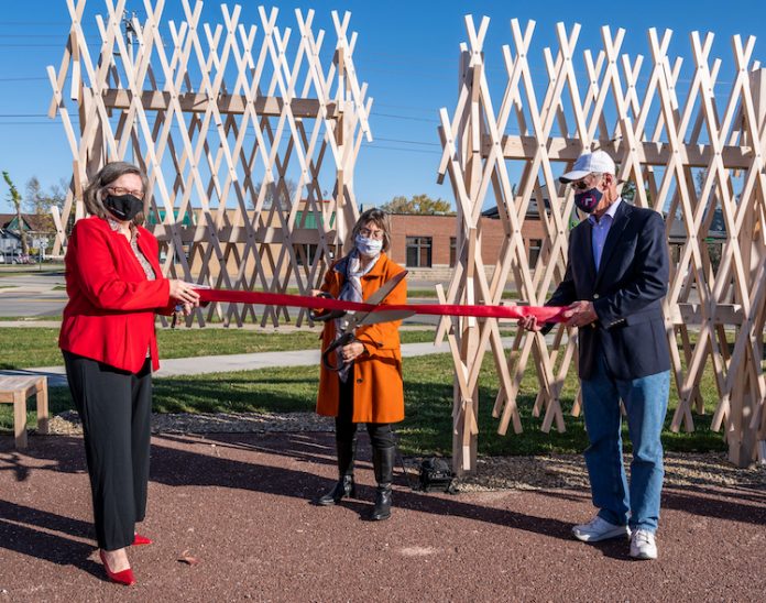 October 06, 2020 — A previously vacant lot at Grinnell’s busiest intersection is now home to a public art piece that crisscrosses memories that tie Grinnell College and the town of Grinnell together.