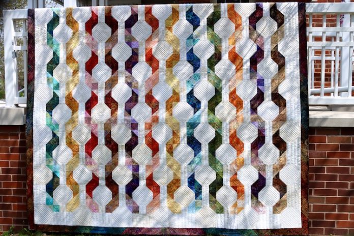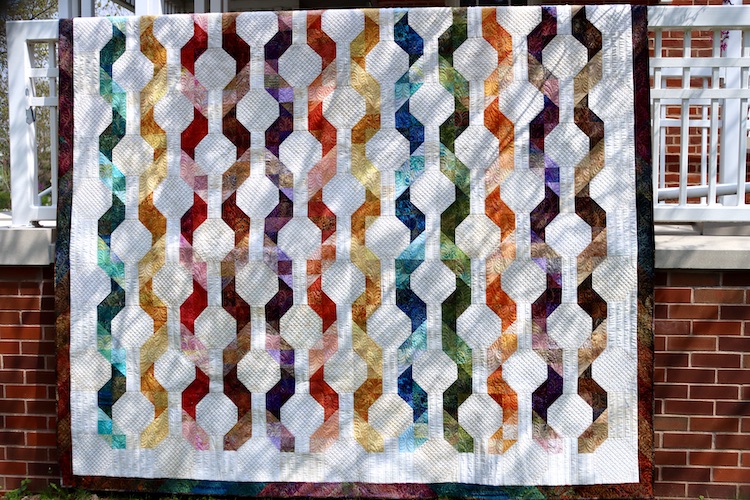 Twisted Ribbons, 2022. Design from Nine Patch and Snowball Quilts by Elsie Campbell, pieced by Jewel Box Quilters Guild, machine quilted by Julie Fisher. 115 x 101 inches.