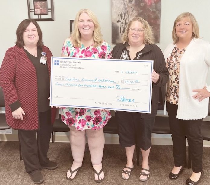 (GRINNELL, IA – July 6, 2022) On June 29, 2022, Jennifer Havens, CEO of UnityPoint Health® – Grinnell Regional Medical Center (GRMC), and Donna Fischer, director of development of GRMC Foundation, presented a check in the amount of $13,511.80 to Capstone Behavioral Healthcare. Receiving the check was Julie Smith, center director, and Nicole Vermeer, office manager, at Capstone’s clinic in Grinnell. The donation will be used to help recruit and retain therapists at Capstone to ensure timely access to compassionate mental health care.