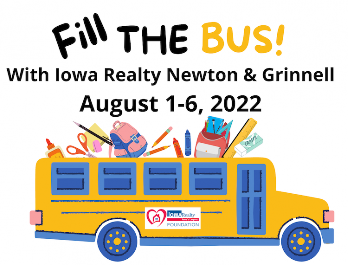 Help Iowa Realty Grinnell and The Iowa Realty Foundation Fill the Bus and Boxes with new school supplies now through Saturday, Aug. 6! You can drop off new supplies for Grinnell-Newburg students at Pagliai’s Pizza in Grinnell!